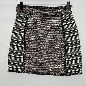 French Connection Pixel Mix Fringed Textured Tweed Finish Mini Skirt - Size 4. Excellent pre-owned, like new condition. Primo quality, inner finished seams, side zipper closure, fringed edging on outer seams, tweed textured fabric, A line, mini. Approximate measurements: 13" waist, 17" length. Colors are black, white, burgundy, grey.
