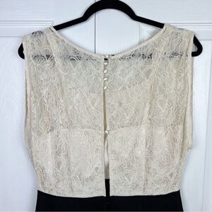 Sleeveless dress with lace top and black skirt, button fastening on centre back neck.