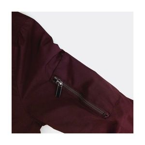 Plum-colored bomber jacket designed with a stand collar and a zip front closure. Ruched seam sleeves with single vertical zip pocket. Button slant pockets.