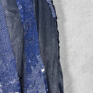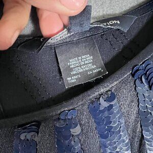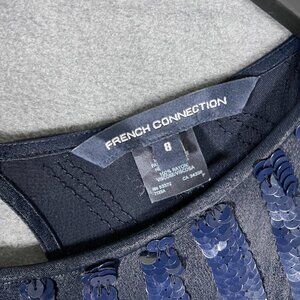 Beautiful, short, navy blue sequined dress by French Connection. The dress features vertical stripes of navy sequins and solid navy fabric, with a keyhole opening at the back of the neck. EUC Questions welcome