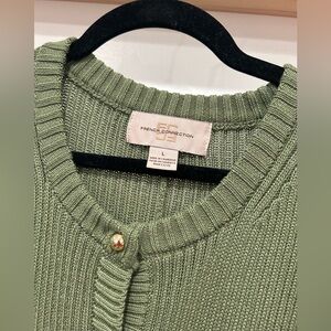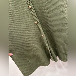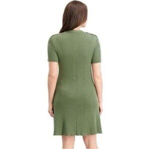 French Connection ribbed button-front sweater dress in an olive green color. It is a short-sleeved, mini-length dress made from a knitted, textured material