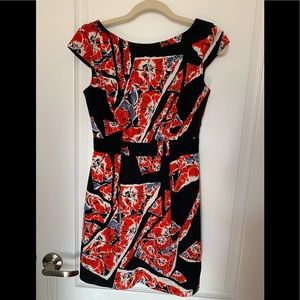I’ve gotten so many compliments on this dress — perfect for snappy casual and cocktail hangouts and weddings. Preworn but in good condition because I loved the graphic floral design so much. This is a cap sleeve dress made of a slightly stretchy cotton blend. Features a boat neckline, square back and a hidden zipper closure. Letting go bc I gained weight.