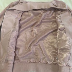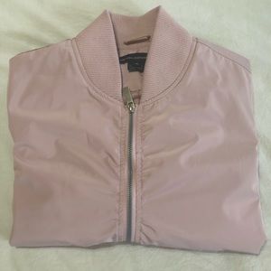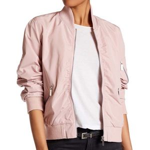 French Connection ruched bomber jacket in blush, baseball collar, front zip, back center and sleeve ruching, lined, ribbed trim, zip pockets in front and on left sleeve, size medium.
