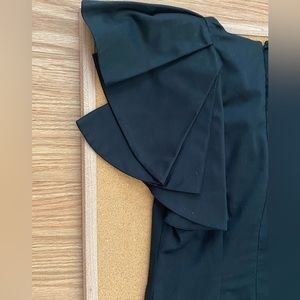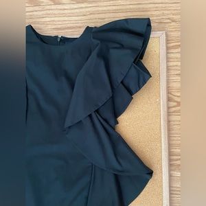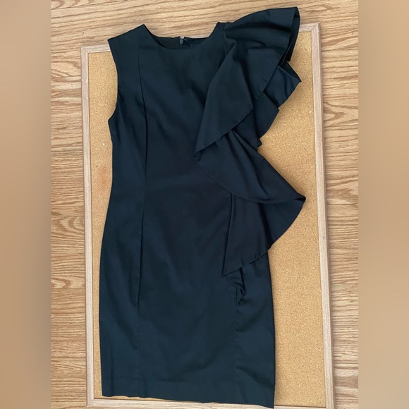 LBD by the French Connection. This dress features a ruffled detail on one side. A zippered back detail. Two darted front seams. Length is 35 inches.