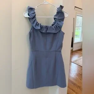 Sleeveless dress with gathered ruffle neckline. Clean, streamlined silhouette. Easy to style for multiple occasions.