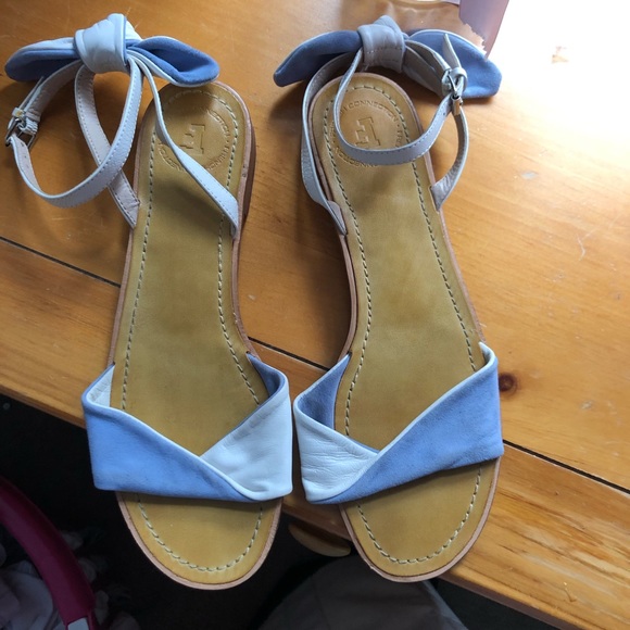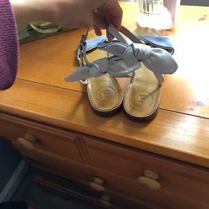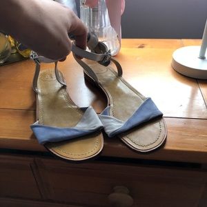 White leather, blue suede sandals with bow detail. Excellent condition. Fits like a 7.5
