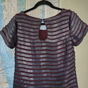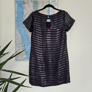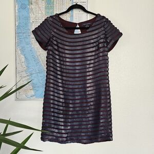 The matte sequinned stripes on this stylish Satellite Brights Sequin Dress by French Connection add edge to the simple shift silhouette. Work a rock-inspired party look with ankle boots and bare legs. Satin dress with matte sequin-embellished stripes. Round neck. Cap sleeves. Fully lined. Keyhole cut-out at back.