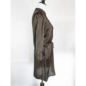 Features and description: shirt dress; 100% silk; unique flower button front; tied waist; ruffle detail; sheen; shiny; brown