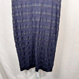 Fully lined navy blue dress with stretch. Short sleeve with sheer details. The material is substantial, classic French Connection.
