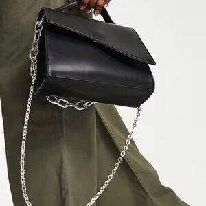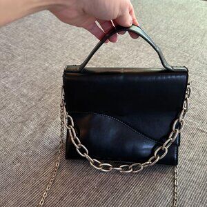 French Connection structured top handle bag with chain detail in black. Used but still in great condition! Faux leather with handle and double chain. Approximately 7"x8"x2.5".