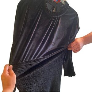 Step out in style with this elegant black velvet dress with ruffle sleeves. Perfect for any occasion, this dress offers a sophisticated look with its luxurious fabric and timeless design.