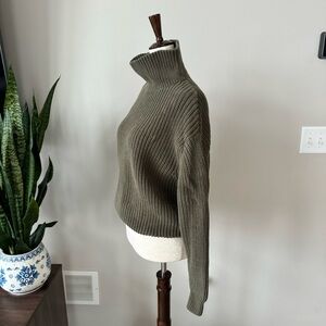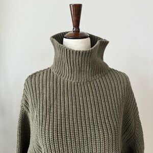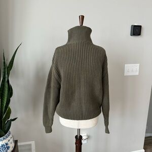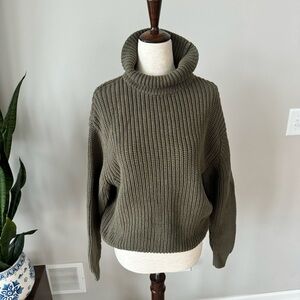 Stay cozy and stylish with this olive green turtleneck sweater. Perfect for layering or wearing on its own.