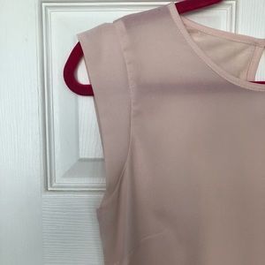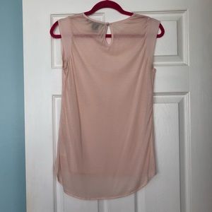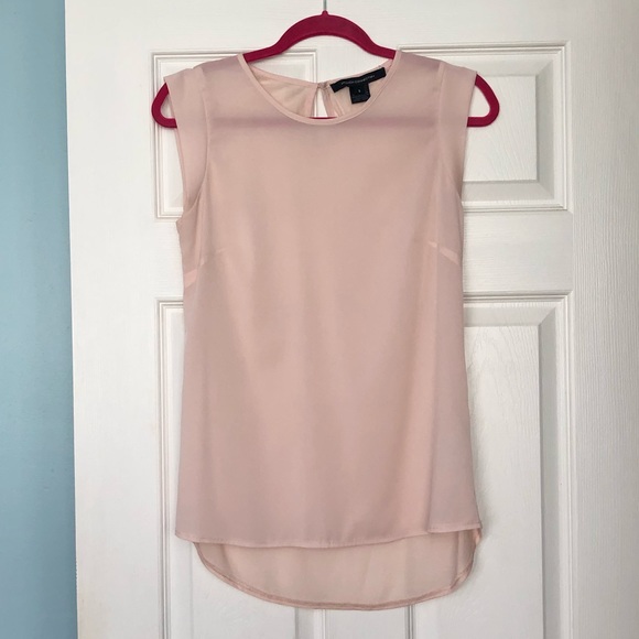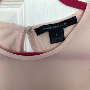 French Connection blush pink top with keyhole button closure at back of neck. Gently used a few times, still in great condition. Front body material is 100% polyester and Back body material is 100% Lyocell. Sleeve material is 100% polyester and wears like a “muscle tee”. A nude color camisole is recommended to wear underneath.