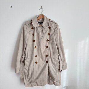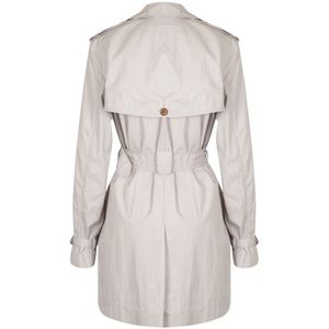 Trench coat with removable parts, collar straps, belt, cuff tabs.