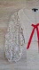 A beautiful reworked piece from French Connection, upcycled by Armoire. This cropped knit sweater features a soft ribbed beige-cream body with a deep V-neckline and a striking red ribbon tie at the front. The standout detail is its sheer lace balloon sleeves with floral designs and gathered cuffs that add a romantic touch.