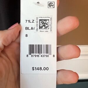 Elegant black mini dress. Features a draped design. Spaghetti straps for a chic look.