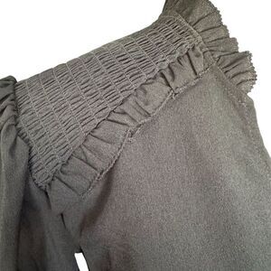 Keywords: French Connection, black blouse, size 4, V-neck, 3/4 sleeve, ruched shoulders, button down, casual wear, spring fashion, machine washable.
