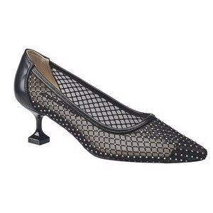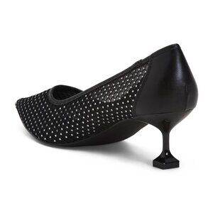 Lightly padded footbed, see-through mesh construction, jewel embellished, flared 2.5 in kitten heel, pointed toe, textile and manmade upper, manmade sole