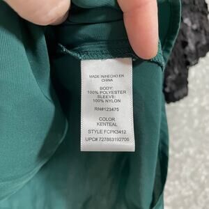Women's glam crop top by French Connection. This emerald green top has black sequin short sleeves, a short length, and a v-neck. It is a silky feel 100% polyester with a 100% nylon sleeves.