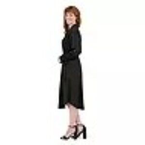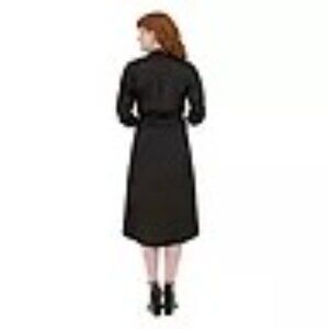 Midi dress featuring collared neckline, button-down closure, and belted waist
