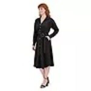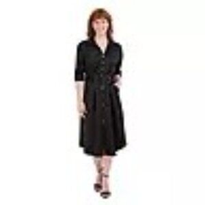 Midi dress featuring collared neckline, button-down closure, and belted waist