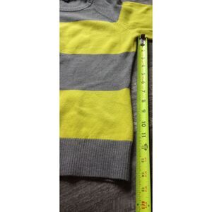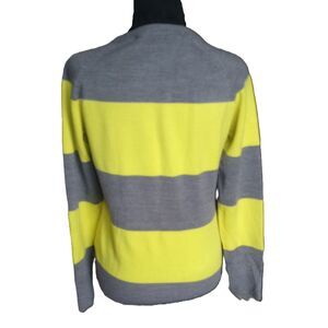 The French Connection Women's Size Medium Long Sleeved Striped Sweater is a stylish and versatile piece perfect for travel or casual occasions. Made from a blend of nylon, spandex, and acrylic, this tight-knit sweater features a classic crew neck design with long sleeves. The yellow stripes add a pop of color to the pullover style sweater, which is machine washable for easy care. With a regular fit and stretch fabric, this sweater offers comfort and style for the modern woman on the go.