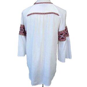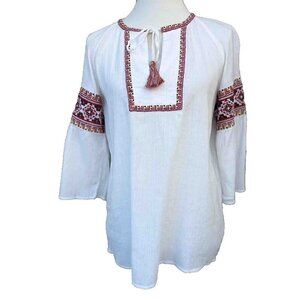 It features an allover crinkled design for added texture, geometric embroidered trims, 3/4-length sleeves, and a tassel tie v-neck fastening for added versatility.