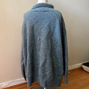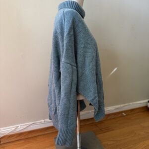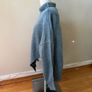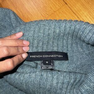 French Connection Women's 100% Wool High Low Cowl/Mock Neckline Knit Cabin Cottagecore Pullover Sweater. Color Teal (blue-ish green). Size Medium. Excellent condition. There are loops on the side of the sweater, but I am unsure what they're for. But it doesn't come with a belt or anything like that.