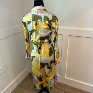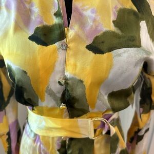 Stylish maxi dress with a bold yellow and green pattern. Features a belted waist and long sleeves. Perfect for any occasion.