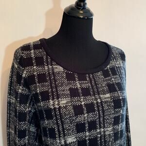 French Connection plaid pullover sweater in black and white. Crew neck. Slight high low hemline. Ribbed hemline. Size M. Excellent preowned condition. Minor wash wear. 100% acrylic.