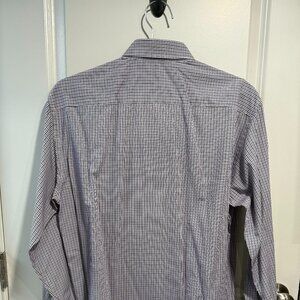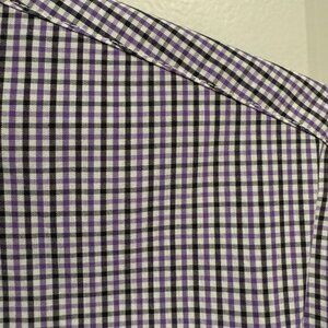Men's size medium long-sleeve button-down shirt by French Connection. It features a classic gingham check pattern in a stylish combination of purple, black, and white. The shirt is designed with a button-down collar and a single chest pocket, making it perfect for a smart-casual look.