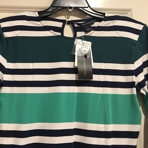 Forrest green, light green, navy and white. Fitted but stretchy dress.