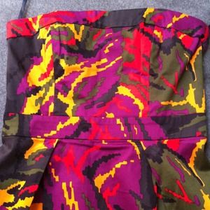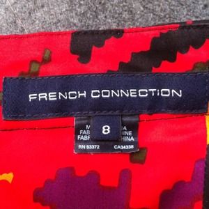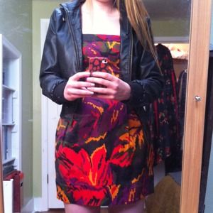 Fitted French Connection dress with POCKETS! It has a beautiful multi-colored motif including black, army green, red, purple, and a mustard yellow. It also has an exposed black zipper in the back. French Connection tends to run small so I would say this is really more of a size 6, even though it is marked as an 8. Worn once on NYE but you would never be able to tell. It is "like new". The faux leather jacket is for sale as well!