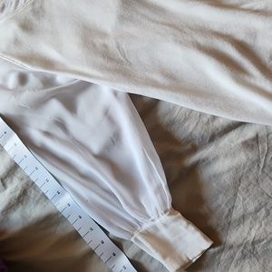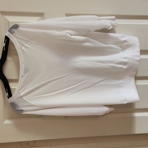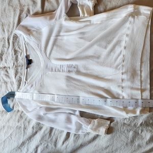 Unique sweatshirt like top with sheer detail at neckline and arms. 3/4 sleeve. Light material. extremely versatile. easy way to add flair and be stylish with almost anything!