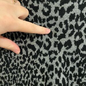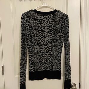 Women’s French Connection sweater. Sweater is gray knit material with a leopard print pattern throughout. Material is soft & super stretchy! In good condition, does have very minor staining as shown—isn’t very noticeable unless up super close! Size medium. Smoke free home!