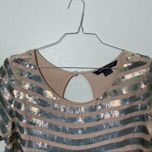 Gently worn. There is one small area under armpit where sequins are hanging. No rips, tears, or stains.