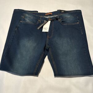 This is new with tags. Zipper fly. Stretch. The color is dark blue with faded accents. The fabric is 62 % cotton, 35 % polyester, 3 % elastane. The leg opening is 16 inches measured around. The fit is straight.
