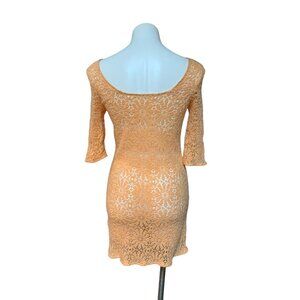 Vintage 90s French Crochet Lace Shift Dress in Peach Color, Made in USA, Los Angeles, California. A Bohemian, Baja, beach junky look, this transparent shift dress is a gorgeous 90s throwback to hippy style. Chunky floral, crochet, daisy-chain lace in a bright and flirty peachy pink color. Deep scoop neck, half sleeves, and bodycon fit.