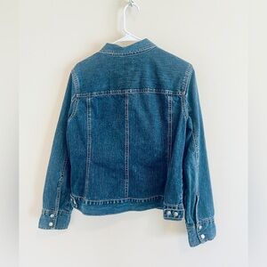 Stylish blue jean jacket. Features front pockets and button details. Perfect for casual wear.