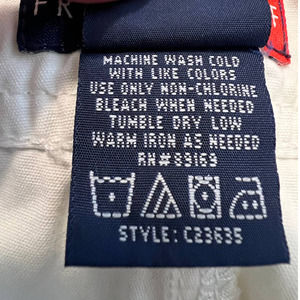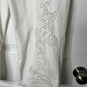French Cuff cropped pants in white with tan embroidery, front pockets, two button close, size 10
