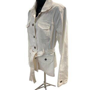 French Cuff White Belted Stretch Denim Buttoned Jacket Sz L
