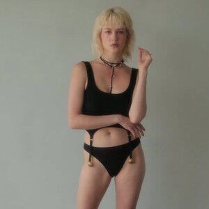 Ultra soft modal hugs your cuves in this modern brief shape. Handmade brass hardware ornaments the back with a snake chain forming a hanger loop detail. Fits true to size. Model is wearing a size small.