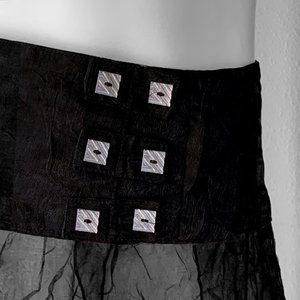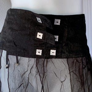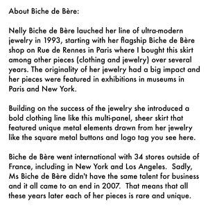 This bold and sassy skirt is the first of my listings of clothing and jewelry by amazing French designer Nelly Biche de Bère. Did I say bold? Made up of sheer crinkled scarf-like panels, this skirt can be as daring as you want to be. Great with a bodysuit and with my 7 For All Mankind thigh-high boots (boots also listed). This skirt can be as daring and in-your-face sexy as you are. I also show it wit a black bralette and black bicycle shorts. In the shop a sales girl put it on over her skinny jeans to model a haute street, maybe even reimagined steampunk look. It can go from goth to updated Barbie over a pencil skirt and booties or heels. Or wear it to a festival or make it the skirt for a long prom dress paired with a great bustier (I have a beauty listed). However you do it you’ll turn heads and melt hearts.