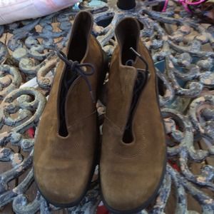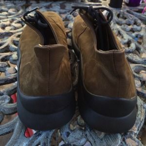 These shoes are too cool, they are designer shoes made exclusively in France. Soft dark olive green leather with inverted laces. That gives them a real urban look. The soles are in excellent condition, too. Super cool