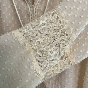 This beautiful style piece has a V Neck with tassel ties. A gathered sleeve with lace cutout.