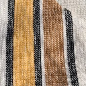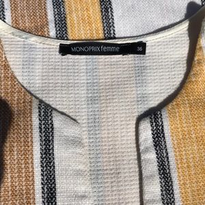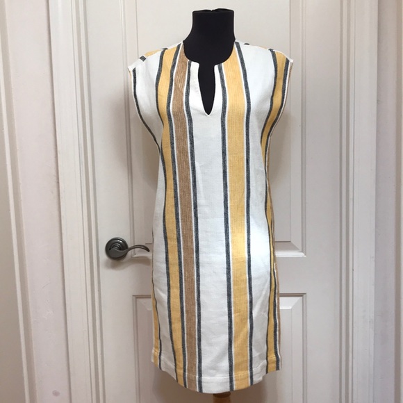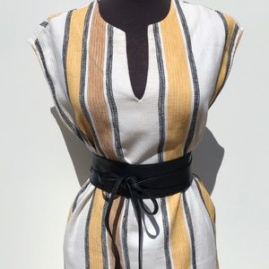 From Paris. Natural beige color, mid-weight cotton weave fabric with black and yellow stripes. Wear as a dress or belted as a tunic over pants or leggings. Belt not included. Excellent quality.