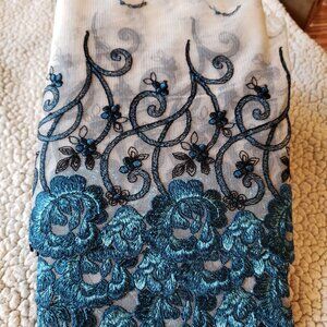 French Embroidered Lace Edging - Blue, Turquoise, Black 7.5" by the yard. This gorgeous lace features roses in shades of blue with back accents on sheer net fabric.. Very soft hand no stiffness.