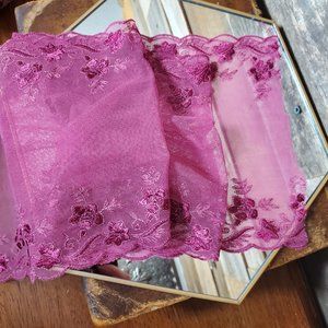 French Embroidered Lingerie Lace - Raspberry 7.5 inch wide x 3 yards. This lace has a mirrored pattern on both sides. Can be used in it's wide form, or cut down the middle and turned into 6 yards. I call it raspberry as that's the closest shade of pink that comes to mind.