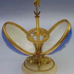French sewing etiology necessaries. Egg shape on alabaster plinth. Blue enamel with floral decor.