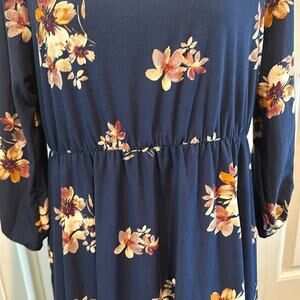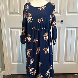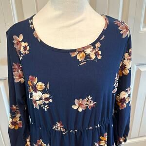 New with tags (NWT) navy blue brushed knit French Grey babydoll style maternity dress. Size is women’s maternity XL. Dress has modest, simple scoop neck and 3/4 length sleeves. Sleeves have a roll tab with brass button details. Floral print in muted in white, beige, goldenrod, rust/pink and light blue. Colorway is classic and elegant and would be stunning for maternity or family photo shoot. Dress is maternity but could be easily worn outside of pregnancy as well, just a simple babydoll design that drapes nicely. Material is very soft and has lots of stretch, very comfortable fit.